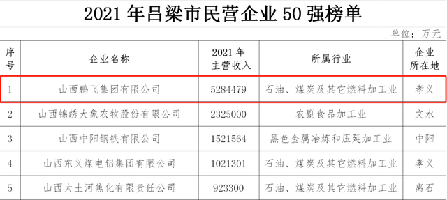 3月22日,由吕梁市民营经济发展局、吕梁市民营企业家联合会联合发布了2021年吕梁市民营企业50强榜单。山西鹏飞集团有限公司位列榜首!